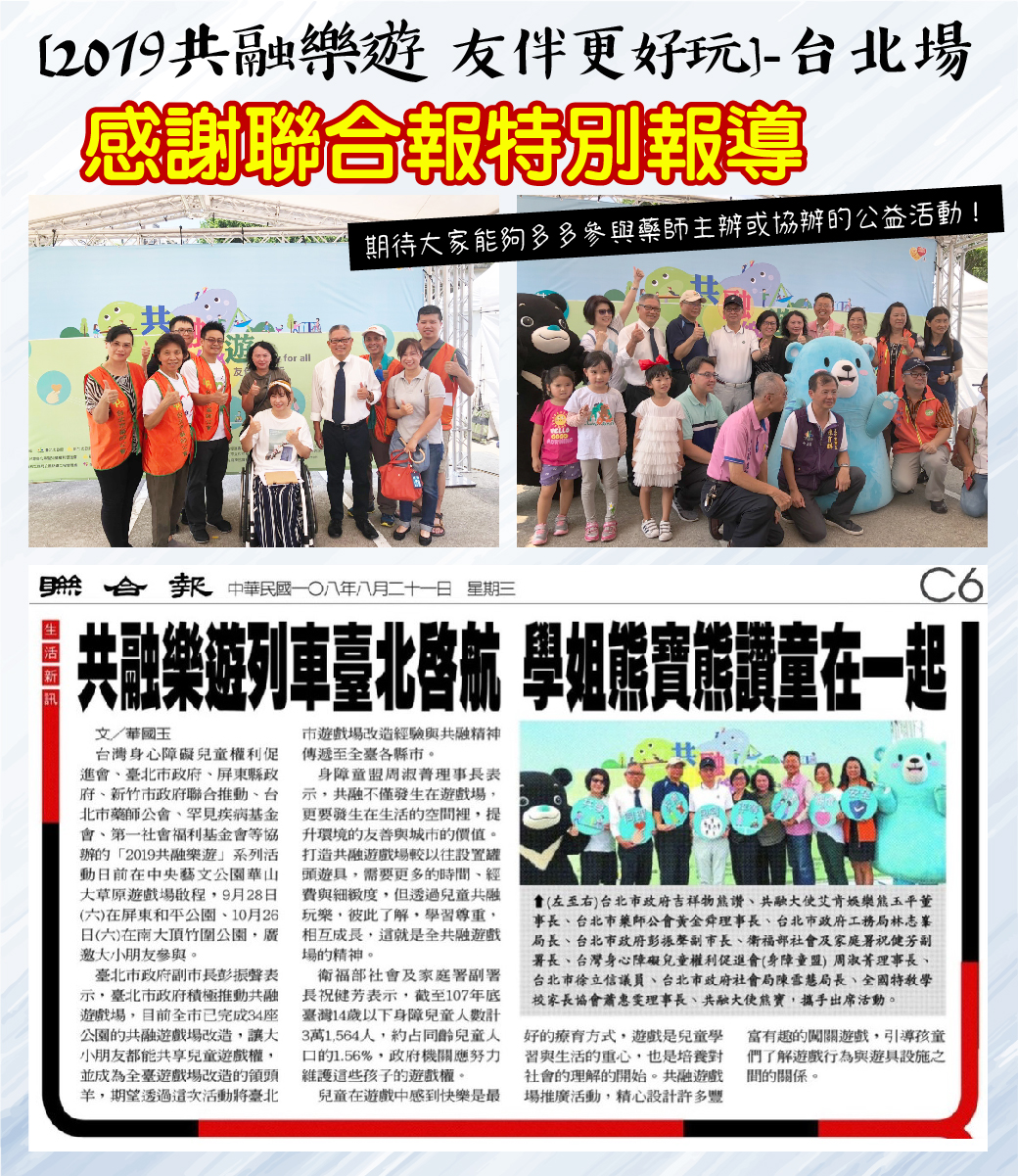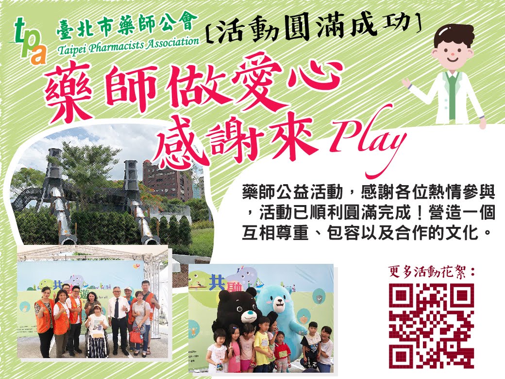 [公益活動]臺北市藥師公會 協辦 藥師做愛心 一起來Play! 2019共融樂遊 友伴更好玩 活動內容:藥師公益活動,與身障兒童互動樂遊,營造一個互相尊重、包容以及合作的文化。 活動地點:華山大草原遊戲場 活動時間:2019.08.17(六) 活動詳情:https://reurl.cc/1yXe8